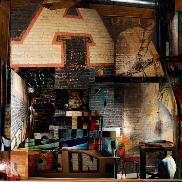 Composite abstract style photo collage. 40 pictures where combined to recreate the loft with hobbies of the proud new owner of her first house.