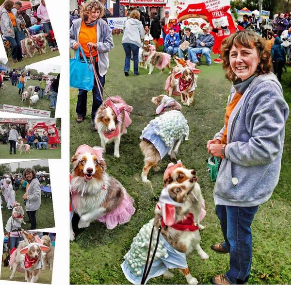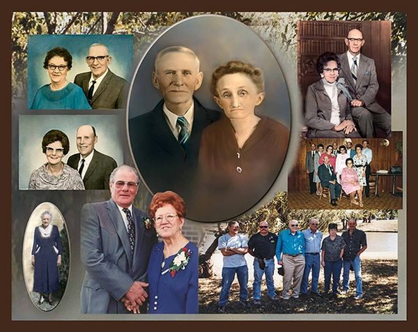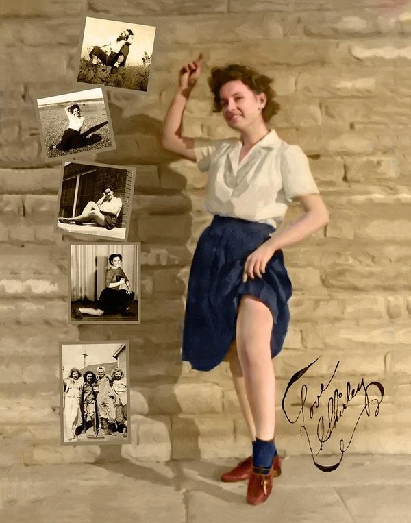 Float Style Collage. Back ground picture with gale in blue skirt was restored, colorized and given a painted effect.
